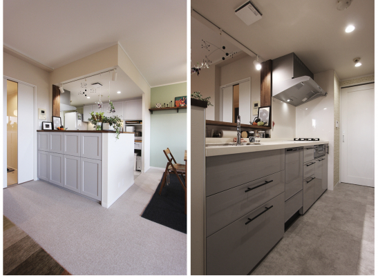 └キッチンワークトップ豊富なパーツ、キャビネット、設備機器や素材を一つ一つ選び出来上がってゆくキッチンは、生活に馴染み、使い勝手の良さと愛着を生み出します。