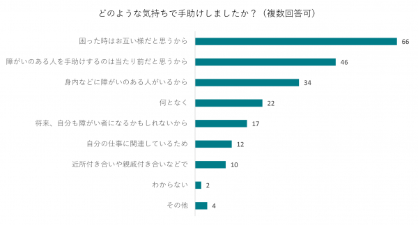 「困った時はお互い様だと思うから」66票、「障がいのある人を手助けするのは当たり前だと思うから」46票、「身内などに障がいのある人がいるから」34票、「何となく」22票、「将来、自分も障がい者になるかもしれないから」17票、「自分の仕事に関連しているため」12票、「近所付き合いや親戚付き合いなどで」10票、「わからない」2票、「その他」4票でした。