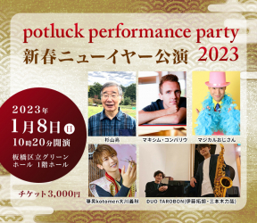 合同会社マジカルおじさんは、2023年1月8日(日)に板橋区立グリーンホール1階ホールでHAPPY NEW YEAR 2023 新春公演「potluck performance party 2023」を開催いたします。杉山亮・SNS総再生回数1000万回突破中の箏奏者・Z世代のサックス奏者・ピアニスト・マジシャン 様々なジャンルのパフォーマーが出演いたします。お越しをお待ちしております。