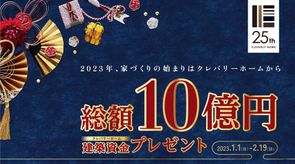 全国で注文住宅ブランドのFC展開を行う株式会社クレバリーホーム(本社:千葉県君津市、代表取締役:松田芳輝)は、2023年1月1日(日・祝)から2月19日(日)の期間に国内全エリアを対象に「 総額10億円 クレバリーホーム建築資金プレゼントキャンペーン 」を開催します。