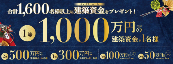2023年1月 1日(日・祝)から2月19日(日)までに、公式ホームページ内の特設サイトにてご応募いただいた方の中から、抽選で「 総額10億円のクレバリーホーム建築資金」をプレゼントします。