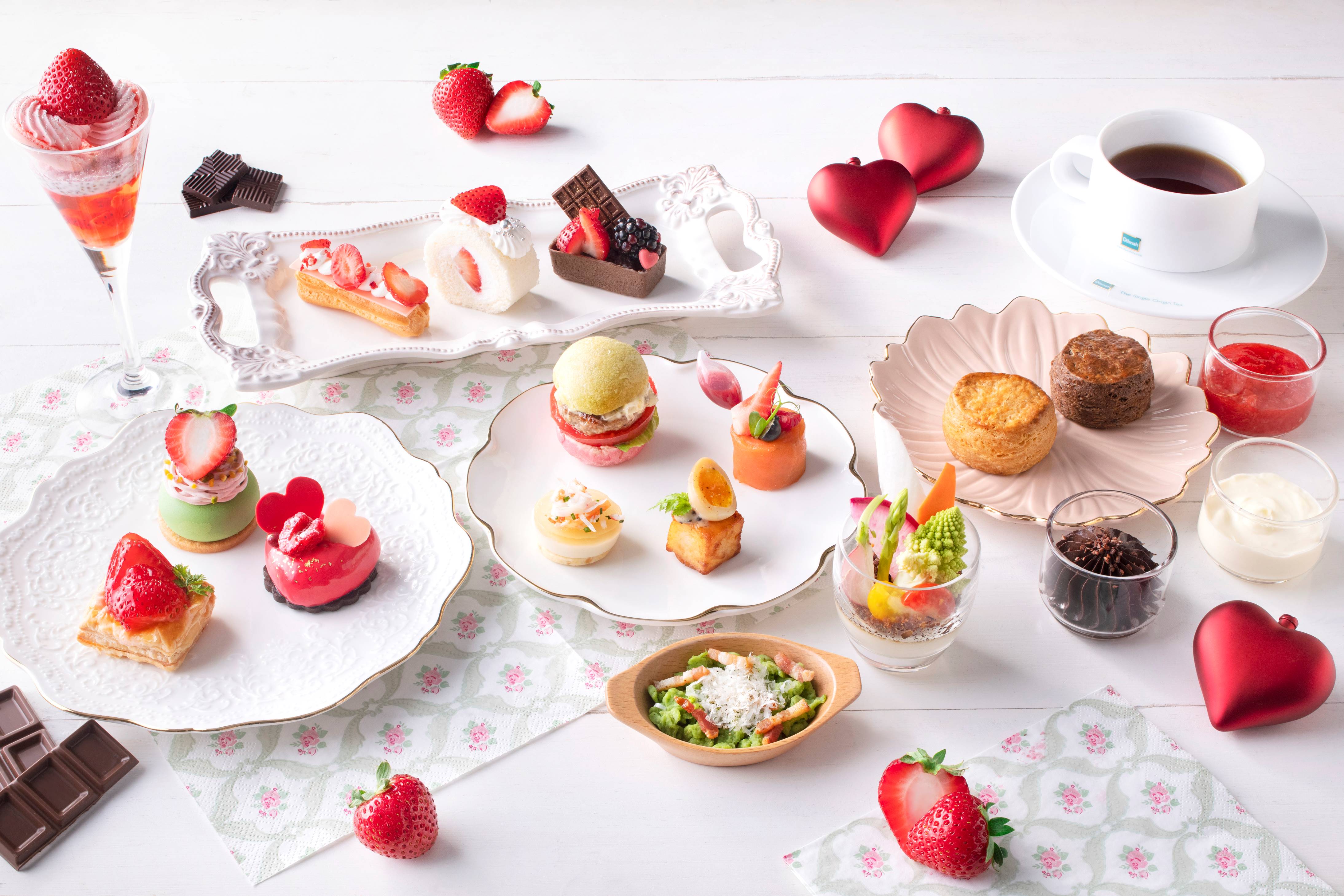 第一弾のメニューからスイーツ、セイボリーともに、一部のメニューが入れ替わります。スイーツには、モチモチ食感の黒米入りダークチョコレートガナッシュを詰めたチョコレートタルトや、甘酸っぱい恋をイメージしたハート形のラズベリームースなど、バレンタイン・ホワイトデーシーズンにぴったりなメニューがラインナップ。セイボリーには、花壇のような見た目が可愛い6種の彩り野菜を使用したバーニャ・フレイダや、ほうれん草を練り込んだ生地に浅草ベーコンを合わせたシュペッツレなど、季節を感じるメニューをお召し上がりいただけます。開催期間ごとにフレーバーが変わるペストリーシェフ自慢のスコーンは、ココアの甘い香りにチャイのスパイシーな香りが加わった、チャイとココアのスコーンをご用意いたします。コンディメントには、苺とリンゴの果肉がたっぷりなストロベリー&アップルジャムと、スーパーフードのカカオニブをトッピングしたヘーゼルナッツチョコレートスプレッドを提供いたします。