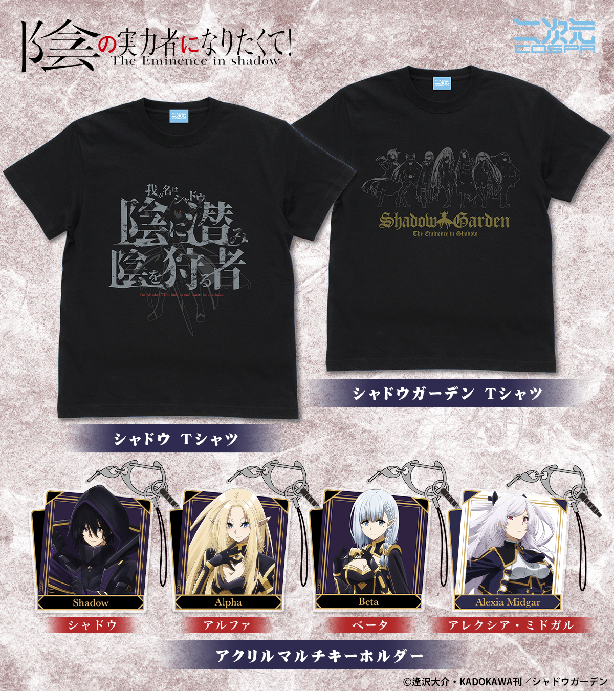 「シャドウガーデン」「シャドウ」Tシャツ、「シャドウ」「アレクシア・ミドガル」「アルファ」「ベータ」アクリルマルチキーホルダーが二次元コスパから登場。