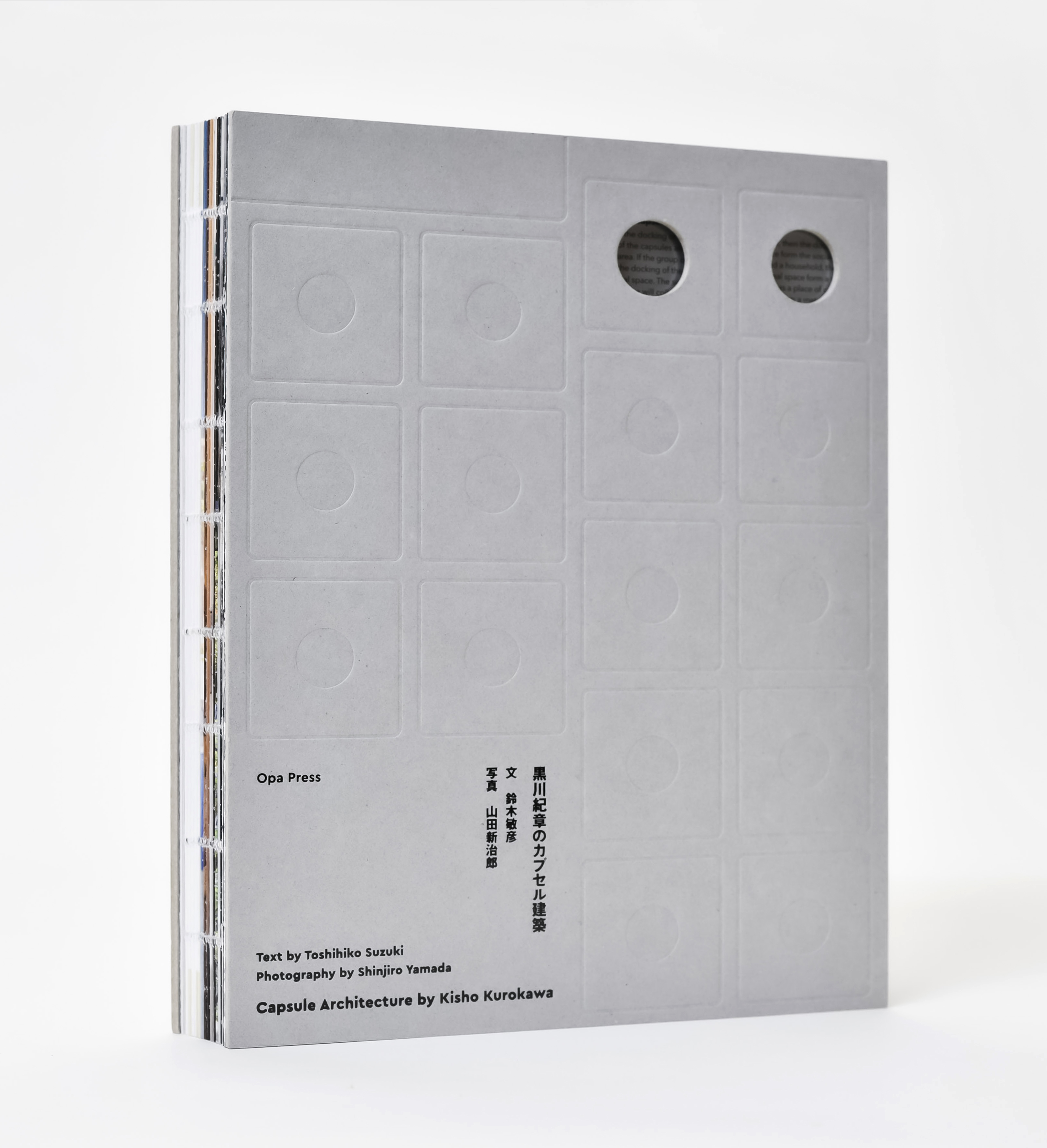 『黒川紀章のカプセル建築』の装丁のモチーフは中銀カプセルタワービルです。著者の鈴木敏彦は80年代後半に在籍していた黒川紀章都市建築設計事務所の「全てが建築だ」という思想のもと、「本も建築だ」と考えました。デザイナーの舟山貴士は、表紙扉に厚口のボール紙を選び、エンボス加工でカプセルのシルエットを表現し、丸窓からカプセル宣言の英文テキストがのぞくように構成しました。また、ビルのエントランスの配色を、黒インクと銀の箔押しでカバーとして再現し、当時の近未来感を表現しました。背幅の糸綴りが見えるコデックス装には武骨な存在感と、ページが良く開き、見開きの写真が中央まで見える利点があります。カバー写真のカプセルハウスKは、中銀カプセルタワービルの竣工の翌年、同じ4つのカプセルを用いて黒川が自身のために建てた別荘です。モダニズム建築の撮影を得意とする山田新治郎が撮り下ろした写真の数々が、立地やインテリア、丸窓の細部までを伝えます。中銀カプセルタワービルは惜しまれながらも解体されましたが、本書の出版は、カプセル建築のミームを多くの読者に伝える一助になったのではないかと考えています。