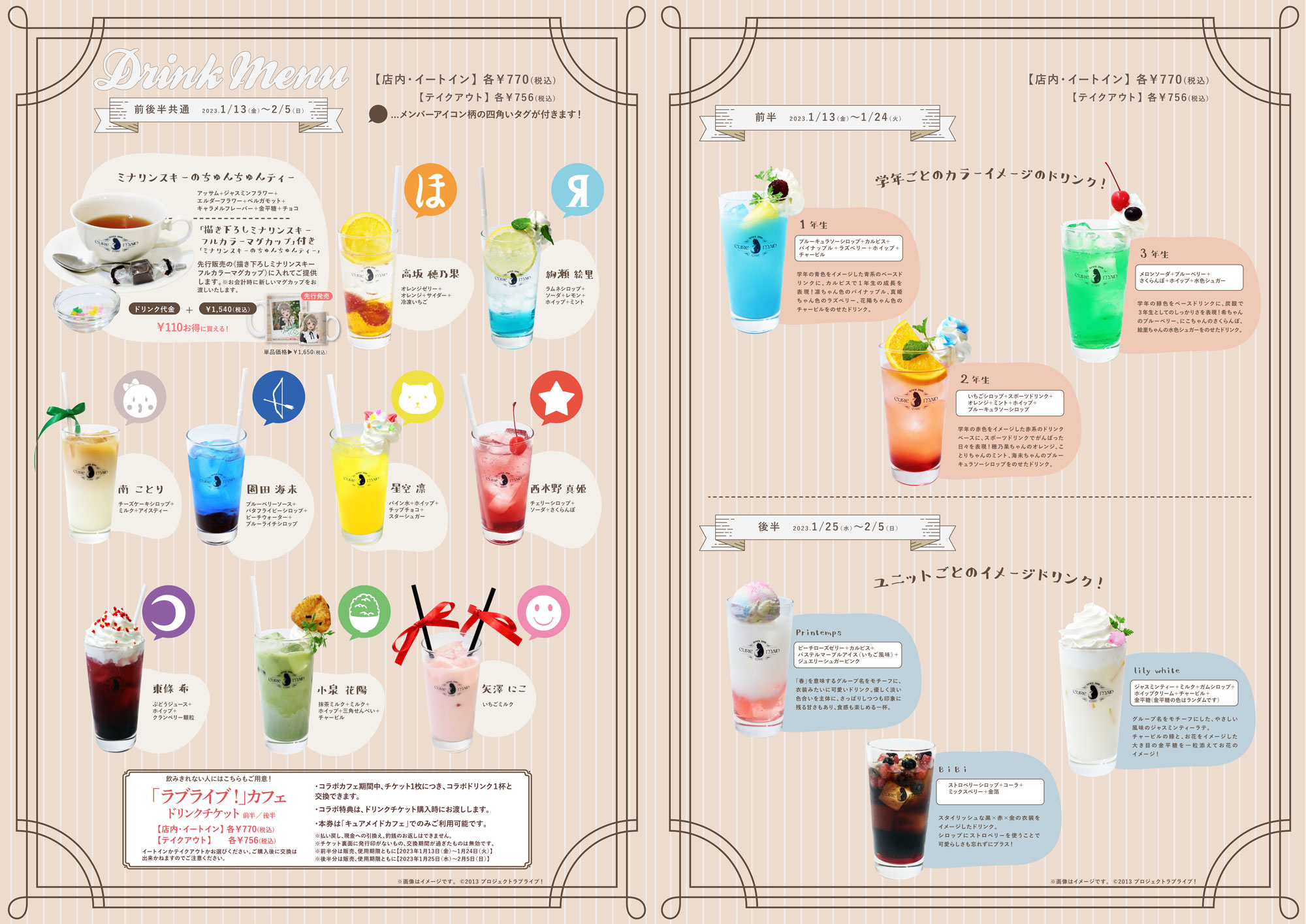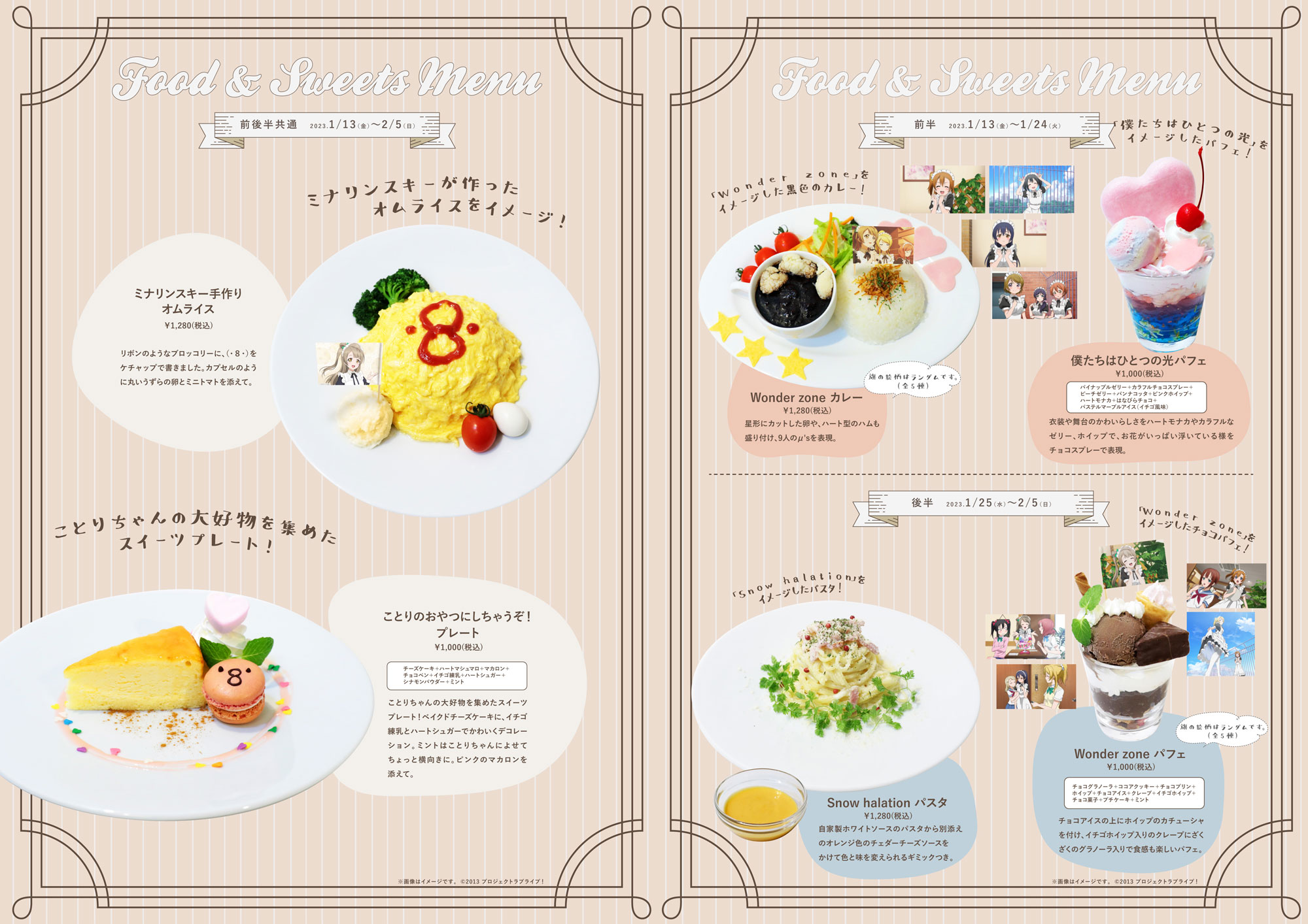μ'sのメンバーたちや楽曲などをイメージしたコラボフードやドリンクをご用意。コラボメニューご注文で限定特典をプレゼントいたします。また、開催期間の前半と後半で一部コラボメニューや特典は違うものがラインナップいたします。
