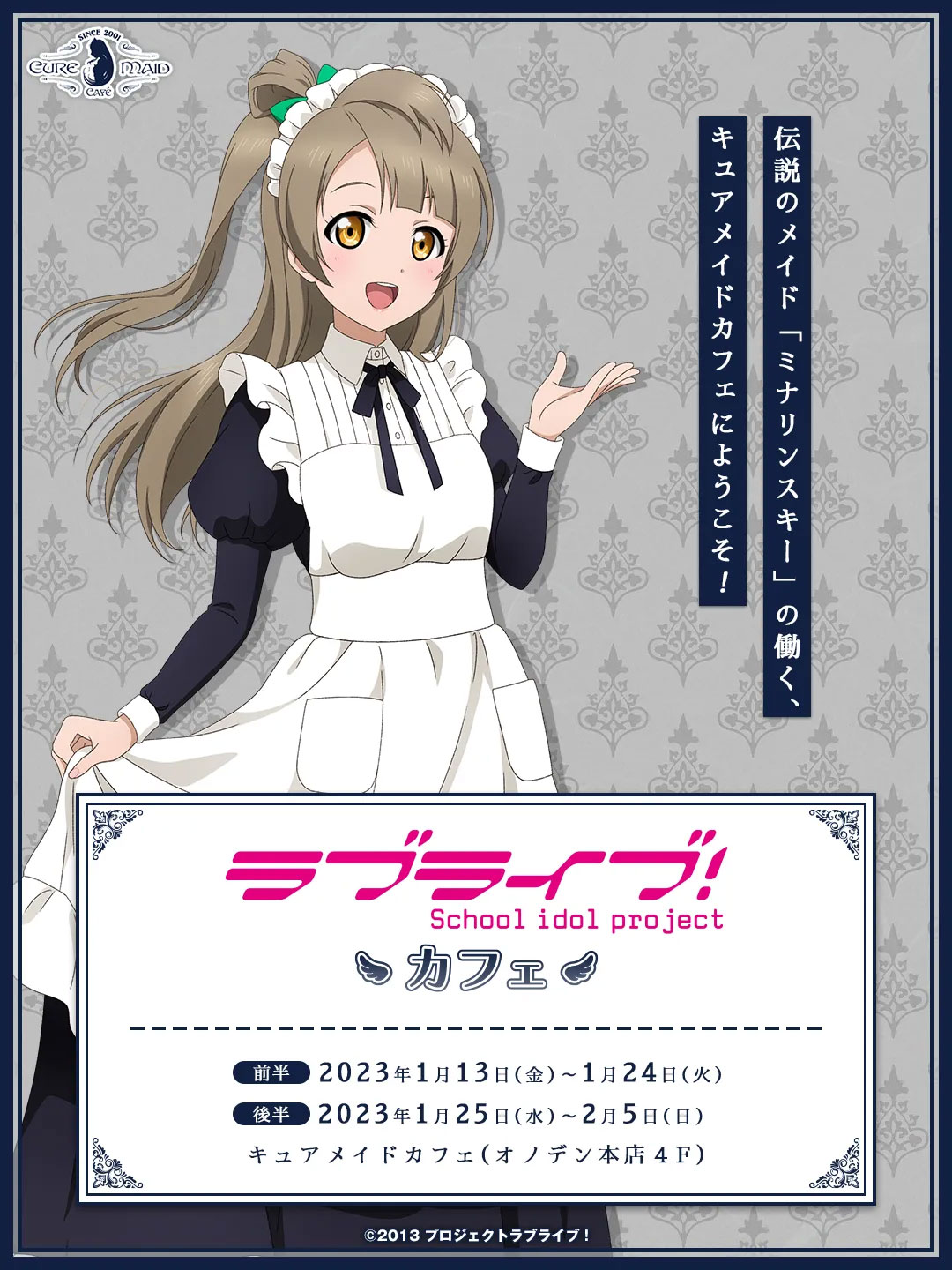 TVアニメ第9話「ワンダーゾーン」に登場したCURE MAID CAFEで「ラブライブ!」のコラボカフェが開催決定いたしました。オノデン本店4階に移転した今も当時の雰囲気を残す店内で“ミナリンスキー”こと南 ことりがお迎えいたします。