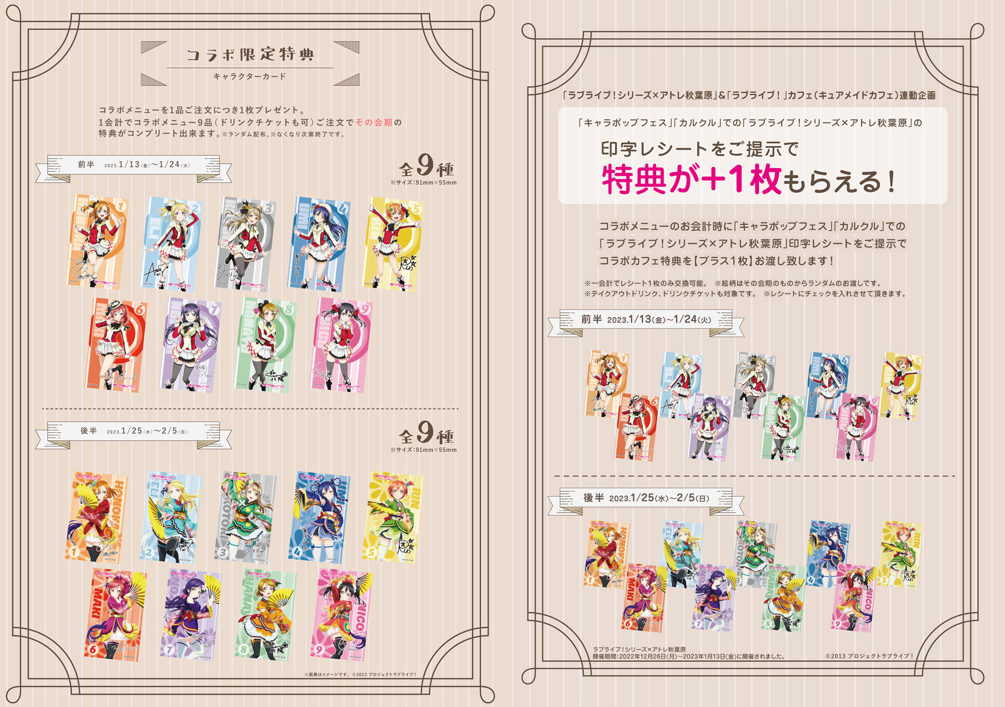 コラボカフェ期間中にコラボメニューを頼み、「キャラポップフェス」「カルクル」での「ラブライブ!シリーズ×アトレ秋葉原」印字レシートをご提示でコラボカフェ特典を【プラス1枚】お渡し致します。