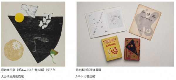 大分市内に店舗を構える古書店・カモシカ書店より、大正から戦後にかけて木版画や装幀の分野で活躍した恩地孝四郎の貴重な本や資料を出品し、当館の版画と交えてご紹介します。「デザイン」の先駆けともいえる恩地孝四郎多元的な創作の展開を、大正期に活躍した東郷青児の作品やMAVO関連資料とあわせてご覧いただきます。