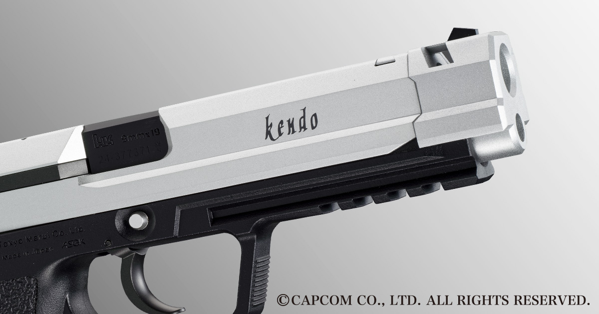 タクティカルハンドガンの基礎となったUSPをベースに、P30やHK45へと進化していく〈過渡期〉を意識した、新規デザインのフレームを採用。さらにオリジナル形状のコンペンセイターを装備し、コンペンセイターの下には20mm幅のアンダーレイルを備えています。また、スライド右側面に「kendo」のロゴをあしらい、グリップ左側面のナンバープレートを再現。シルバー仕上げのスライドとブラックのフレームは、塗装によって表現しました。