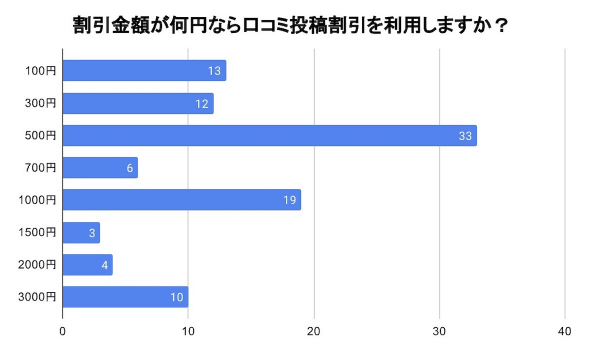 「割引金額が何円なら口コミ投稿割引を利用しますか?」の質問では、『500円』が最多の33%となりました。100円、300円、500円の結果を含めると58%となり、半数以上の人が500円の値引きがあれば、口コミを投稿したいと考えるようです。