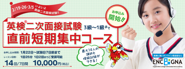 英検上位級取得に特化して17年の実績があるオンライン英会話ENC/GNA(運営:株式会社スリーピース代表:鈴木 佳祐 本社:神戸市)は、2月19日(日)2月26日(日)3月5日(日)実施予定の「英検(R)二次面接試験直前短期集中コース」を開講いたします。