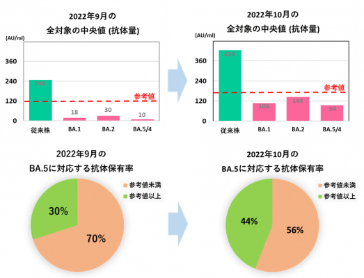 そこで、オミクロン対応ワクチンが一般導入された2022年9月以降、オミクロン変異株に対する抗体保有率の現状を毎月測定し、オミクロン対応ワクチンの有効性(BA.5に対する抗体の有無)や効果(抗体量)を調査することにいたしました。