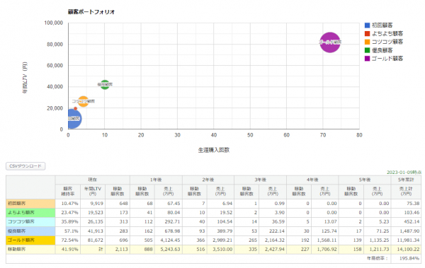現在の継続率(顧客維持率)を元に、5年先までの顧客数と売上を予測・表示します。顧客BSのポイントは、「新規顧客を獲得せずに既存顧客だけで売上を構築するとどうなるか」を予測する点にあります。 つまり、ショップあるいはブランドを支持しファンになってくれた方の人数(稼働顧客数)と得られる売上(5年間の売上累計額)を、CRMの成果として数字で測ることが可能になりました。
