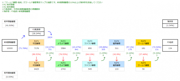 F1~F5までの顧客分類ごとの維持率・離脱率・復帰率をマップにし、最終的に新規獲得顧客がどのくらい「F5(ゴールド顧客)継続」まで残存するかを「残存率」という指数で表したものです。残存率は、新規獲得に依存したEC運営になっていないかどうかを判断する指標になります。