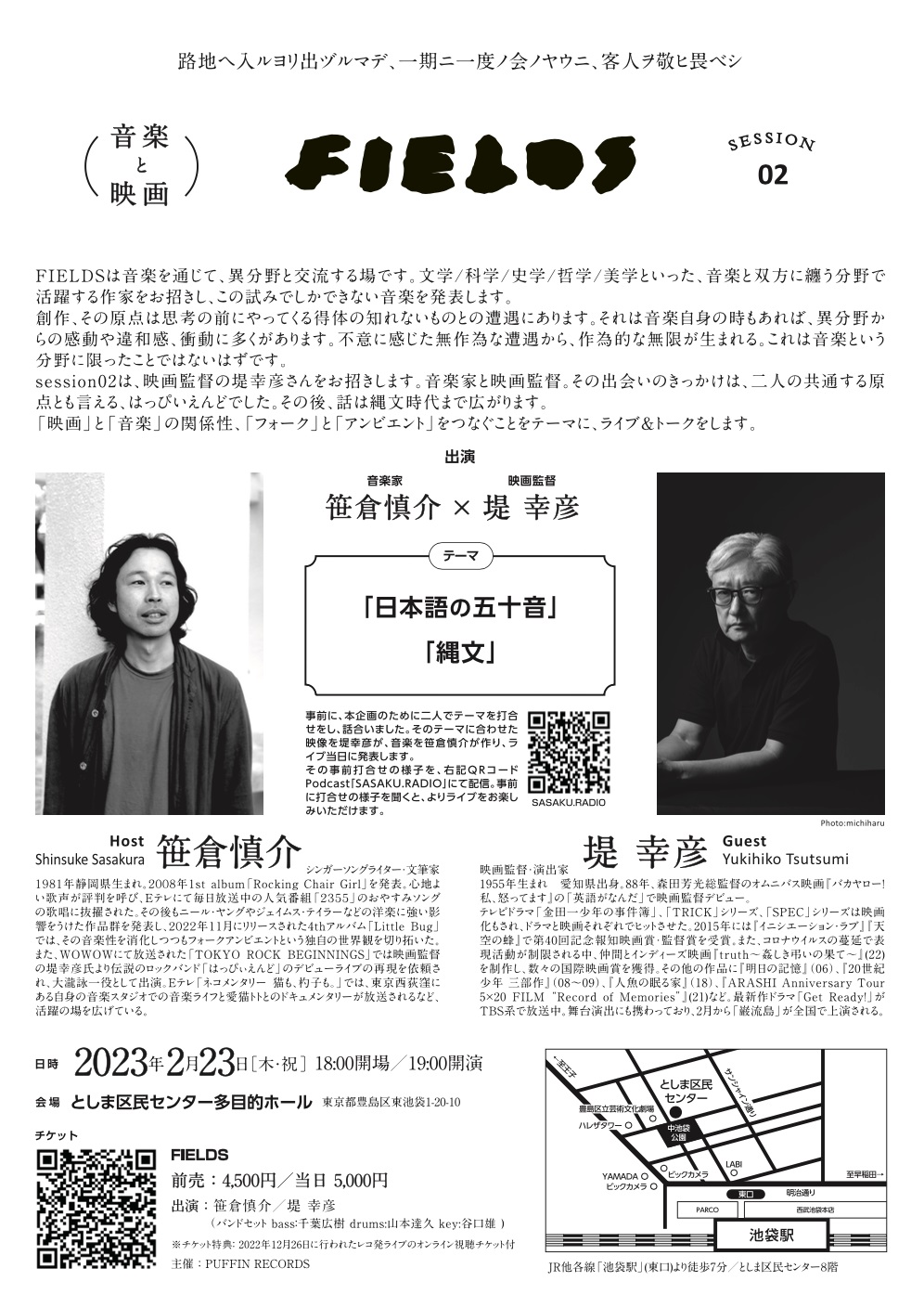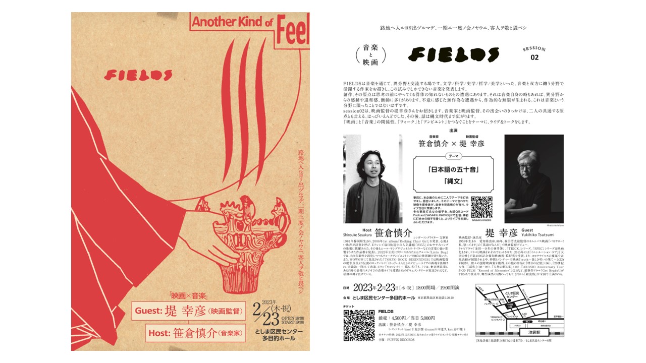 現在 笹倉慎介のPodcast番組「SASAKU.RADIO」で配信中の「FIELDS #02 ゲスト : 堤幸彦 (映画監督))」では、イベント前に収録した2人のトークが聞けます。同番組では笹倉と堤氏の出会いや、映像と音楽の関係性、堤幸彦氏の音楽観等に加えて、「日本語の五十音」や「縄文」の話でも盛り上がっており、「FIELDS」session 02 当日には、この内容を受けて「縄文」をテーマに笹倉慎介が作曲した楽曲が、堤幸彦 制作の映像に合わせて演奏されます。