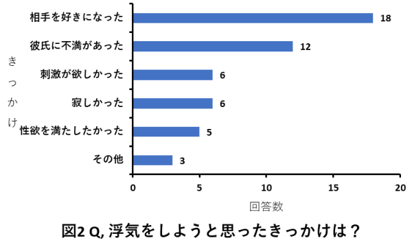 最も回答数が多かったのは、「相手を好きになった」、次いで「彼氏に不満があった」という回答が多く挙げられていました。