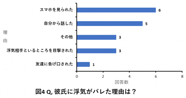 彼氏に浮気がバレたと回答した方を対象に「浮気がバレた理由」について質問を設けています。結果、「スマホを見られた」という回答が最も多く選択されていました。