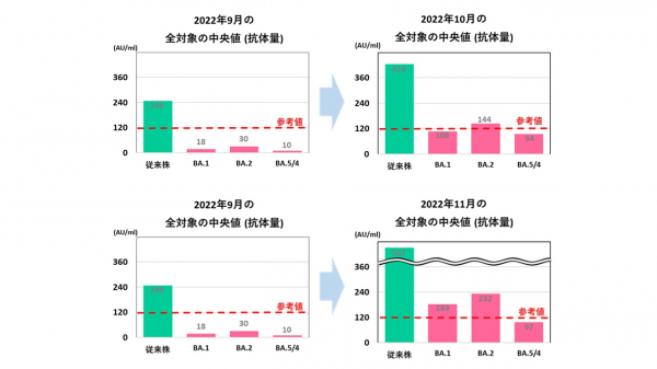 ただ、2022年9月末時点と比較すると、2022年10月末以降はBA.5に対する抗体も増加していますが、2022年10月末から2022年11月末にかけては、ワクチン接種の増加指標となり従来株に対する抗体量が増加しているにもかかわらず、BA.5に対する抗体量は、ほとんど変化が見られませんでした。また、2ヶ月以上経過しても、十分な抗体量(参考値[※2])を保有できていないことが分かりました。