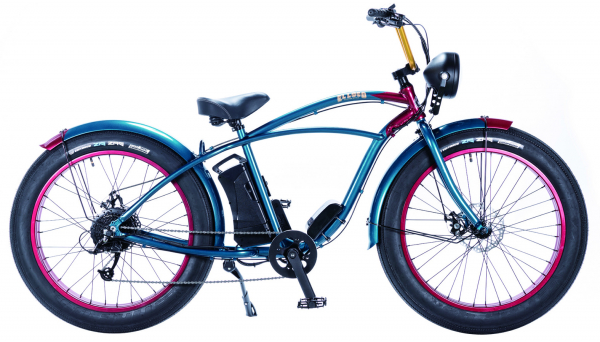 まず目を引くのが、ストリームラインのクルーザーフレームにレトロルックのセミスリックファットタイヤを装備したスタイルでしょう。タイヤにぴったりと沿うようにデザインされたフェンダーやハイライズのハンドルと相まって、オールドスクールなアメリカンバイクを髣髴させるシルエットに仕上げています。
