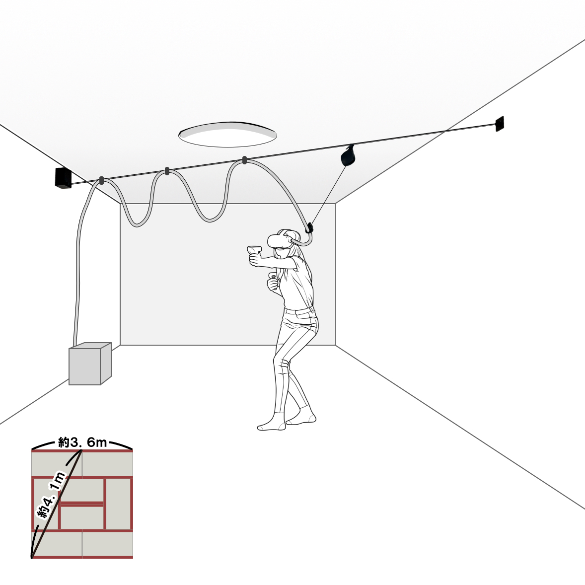 「ケーブル・ランニングワイヤ VR」は直径1.5mmのスチールワイヤをプレーヤーの頭上に通して使用します。最大4.2m(本体厚を含む)の長さで、一般的な8畳間の幅(約3.6m)もラクラク。