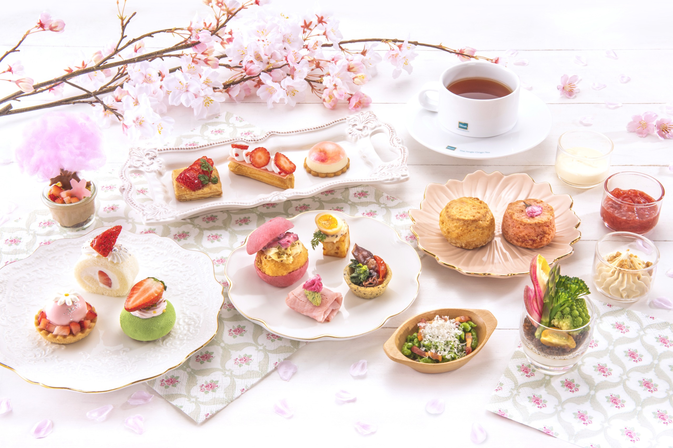 今回のアフタヌーンティーは、卒業・入学シーズンに合わせた「桜」がテーマの華やかなアフタヌーンティーです。ストロベリーを中心としたスイーツ8種類と旬の食材を楽しめる6種類のセイボリー(軽食)を提供します。営業時間内であれば時間制限がないので、お料理とともにフリーフローの紅茶やコーヒーを、心ゆくまでお楽しみいただけます。