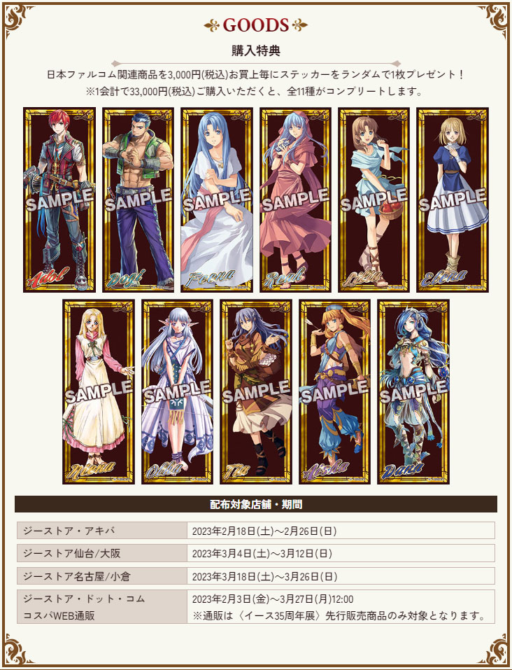 グッズを購入するともらえるイースキャラクターの【特製ステッカー(全11種)】プレゼントも実施予定です。