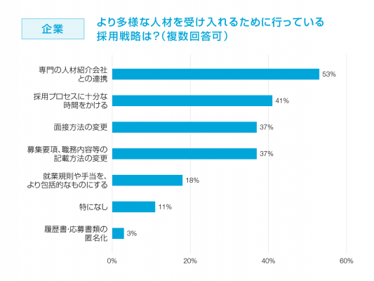 53%の企業が多様な人材を受け入れるための採用戦略の最重要事項として「専門の人材紹介会社との連携」をあげました。次いで「採用プロセスに十分な時間をかける(多様な候補者を理解するための時間を増やす)」(41%)、「面接方法の変更(例:多様な面接パネル、オンライン評価の導入)」(37%)となりました。経済の不透明感が増す中、2023年まで深刻な人材不足が続き、全国の求人倍率は1.28倍(2022年平均 出典:厚生労働省)となっています。このような状況を打破するためには世代、文化、性別のギャップを超え、そして創造性と生産性を高める組織にする企業文化を形成するため、採用のプロセスからしっかりと戦略を練り、人材の確保することが重要です。