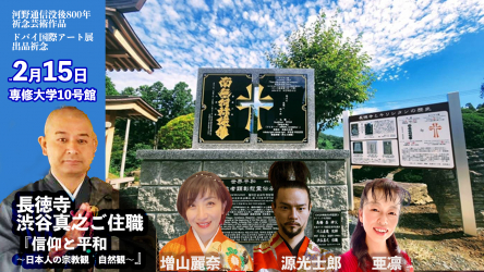 2月15日の専修大学の講演会では、渋谷真之氏の講話「信仰と平和~日本人の宗教観 自然観~」の他、増山麗奈、亜凛などドバイ国際アート展「ワールドアートドバイ」参加芸術家によるシンポジウム「サムライの魂を世界に~ドバイ国際展にむけて出陣」、源光士郎による演武も行われ「ワールドアートドバイ」出品作品も展示されます。