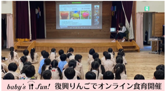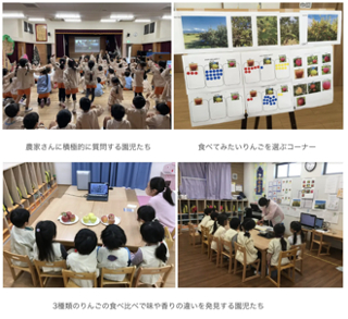 2022年11月17日、18日には、長野県のりんご農家キタイチ果樹園さんと9園の園児たちをオンラインで繋ぎ、り んごの種類や生産過程の紹介、また台風被害についてなどを園児たちとリアルタイムでコミュニケーションを取 りながらお話したり、園で実際に3種類のりんご(ふじ、王林、あいかの香り)の食べ比べを実施しました。