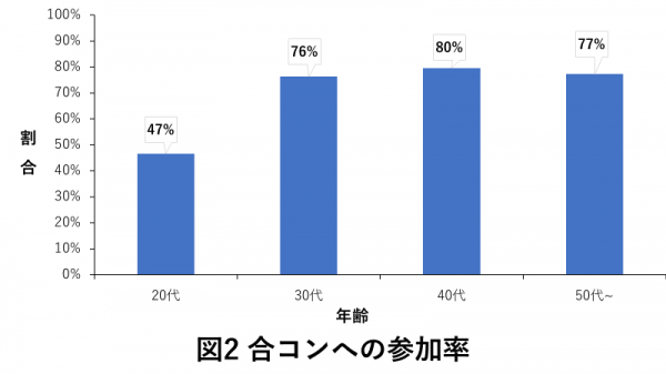 合コンへの参加率を調査したところ、20代の参加率が47%と最も低いことが明らかとなりました。