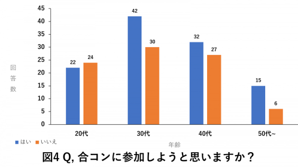 もし自分に恋人あるいは結婚相手がいないと想定した場合、合コンに参加しようと思うかどうかについて質問をしました。