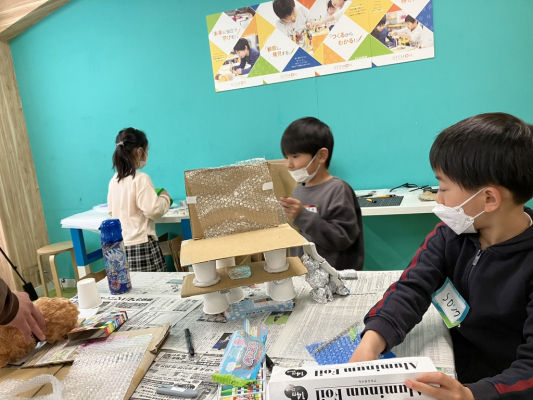 子どもたちは絵本を読み、物語の登場人物の課題を抽出し、問題を解決する方法をチームで話し合い、解決するためのものを実際に作り、発表を行いました。作る過程では、身近にある材料を組み合わせ、チームでコミュニケーションを大切に協力しながらものづくりを行いました。