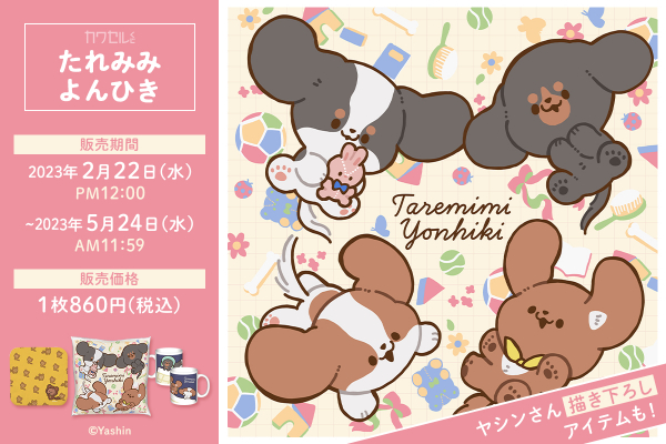 株式会社インクルーズ(東京都渋谷区、代表取締役社長 山﨑 健司)が企画・運営するフィジカルグッズのオンラインくじ「カワセルくじ」にて、2月22日(水)より、「たれみみよんひき」のくじが発売開始になりましたことをご報告させていただきます。