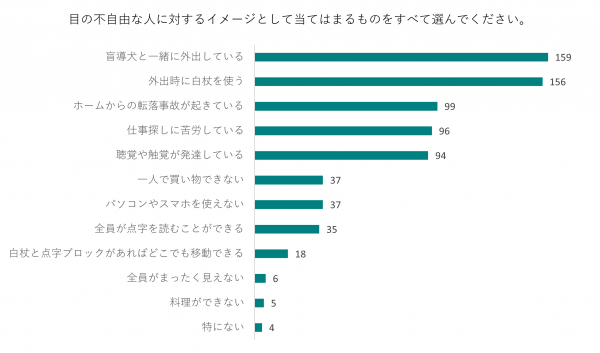 【質問】目の不自由な人に対するイメージとして当てはまるものをすべて選んでください。(複数回答可)