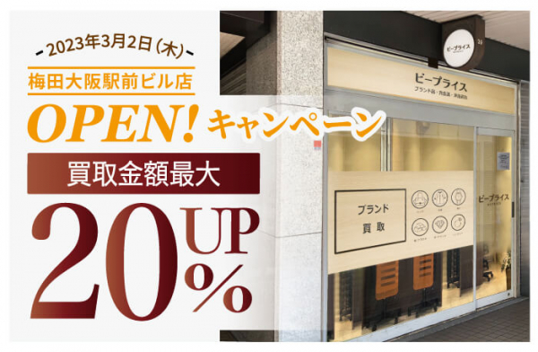 経営ビジョンに「クローゼットを必要なモノで満たす」を掲げ、ファッションブランドアイテムの買取や販売を手掛ける株式会社ビープライスは、「ビープライス梅田大阪駅前ビル店」が2023年3月2日(木)にオープンしたことを記念してキャンペーンを実施します。<運営:株式会社ビープライス(所在地:大阪市天王寺区・代表取締役 玉城 貴也)>