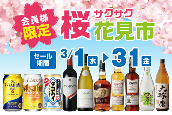 全国に187店舗で酒の専門店をチェーン展開する株式会社リカーマウンテン(本社:京都市)は、3月1日(水)~31日(金)の間、深夜営業店舗などを除く一部店舗で「会員様限定 桜サクサク花見市セール」を開催いたします。