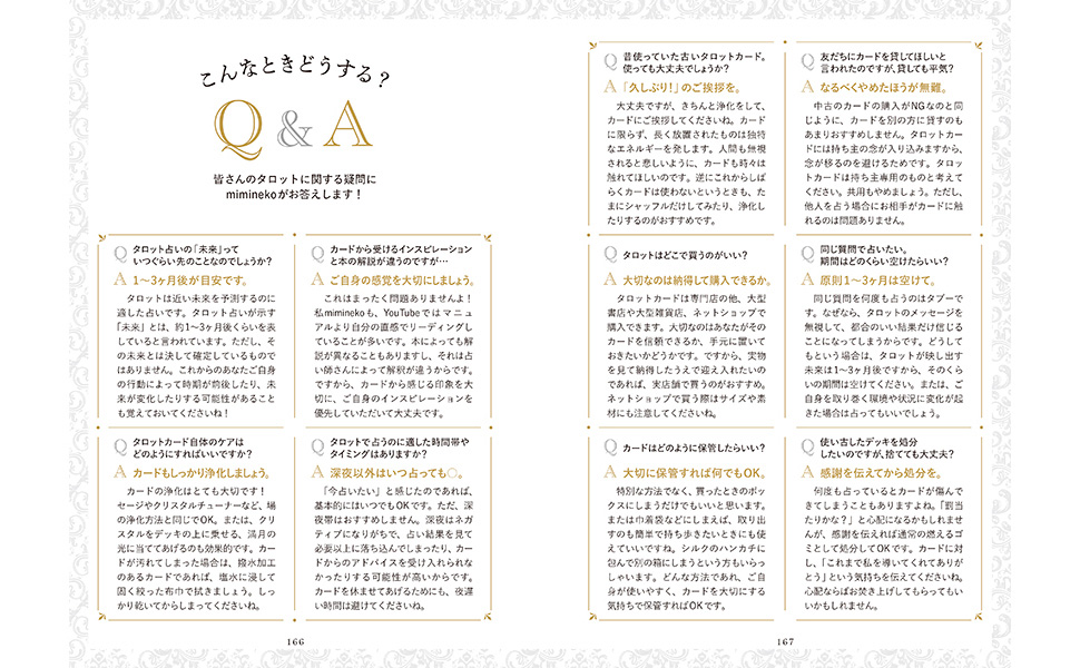 実際にタロット占いを始めると「カードを捨てるときはどうしたらいいの?」「友だちにカードを貸してもいいの?」など、疑問がわいてきます。そんな悩みも解説できます!