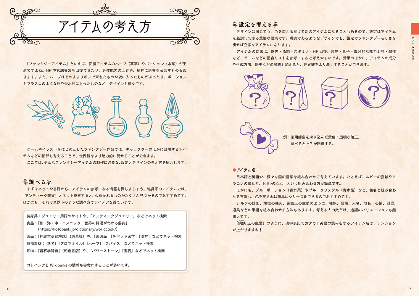 本書では、ゲームやイラスト、漫画などのファンタジー作品に欠かせない「アイテム」について、名前の付け方から効果、使い方、成分、歴史などの設定の考え方、デザインの仕方を解説しています。