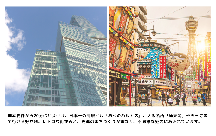 ■アクセス面も、南海電鉄&大阪メトロ「天下茶屋駅」まで徒歩9分、そこから難波駅まで南海電車で2駅5分、関西空港までも乗換なしで35分。また堺筋線は京都・通天閣・黒門市場など主要観光地に直結しているロケーションです。