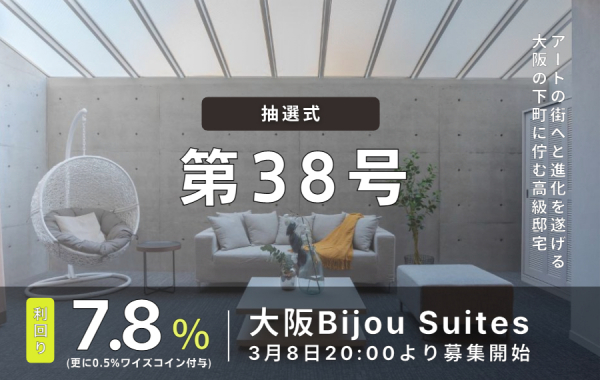 ■天下茶屋は、古き良き昭和の街並みを残しながらも、様々なレストランやショップがオープンを続けており、近隣駅には、星野リゾートが手がけるホテル「OMO7」も開業し街全体が一段と賑わいを見せているエリアです。予定利回りは7.8%+ワイズコイン0.5%、運用期間12ヶ月。募集開始は3月8日(水曜日)、夜20時より抽選式にて募集を行います。インカムゲイン+キャピタルゲイン型にて配当を行うファンドです。