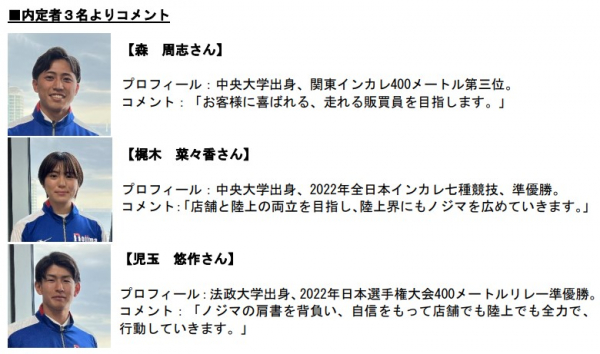 今回の採用は、勝ち負けのあるスポーツの世界で努力されてきた人財に、社会人として業務と陸上競技活動を両立できる環境を提供するとともに、選手としての活動費用を支援するもので、「将来的な実業団登録も視野に入れた」ノジマでは初めての試みとなります。