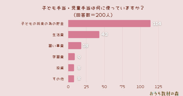 「子ども手当・児童手当は何に使っていますか?」とアンケート調査した結果、1位は『子どもの将来の為の貯金』でした。