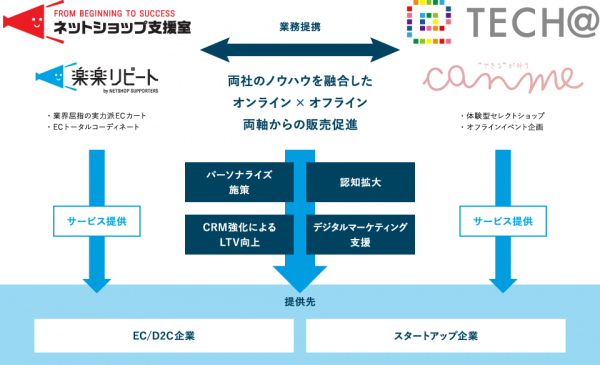 株式会社ネットショップ支援室(本社:東京都港区、代表取締役:山本 皓一朗、以下ネットショップ支援室)と、"女性の好き"が集まる体験型セレクトショップ「canme(キャンミー)」を運営する株式会社テックアット(本社:福岡県福岡市、代表取締役:延山 勇貴)は、2023年3月9日より資本業務提携したことをお知らせいたします。今回の提携により、D2Cで通販をされているブランド様のオンライン・オフライン双方での売上拡大を推進してまいります。