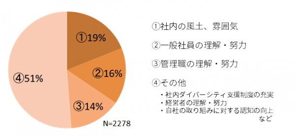 D&I(ダイバーシティー&インクルージョン)を推進させていくには、「社内の風土、雰囲気が重要である」と考える従業員が最も多い。