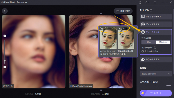 AIモードによって、画像処理結果が異なるスタイルで表示されます。フェイスモデルを例とし て挙げると、「鋭い」効果は、画像の細部を見やすくするため、画像を鋭く角張らせて見せる働きがあります。 一方、「柔らかい」効果は、画像をより心地よく、自然に見せることができます。