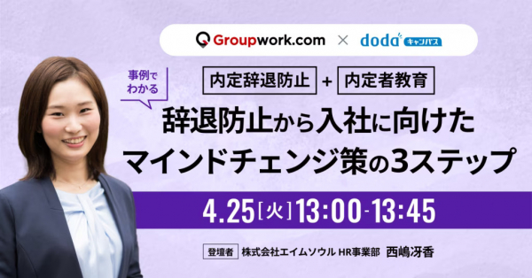 採用支援コンサルティング事業を手掛ける株式会社エイムソウル(本社:東京都台東区、代表取締役:稲垣 隆司)は、2023年4月25日(火)に、株式会社ベネッセi-キャリアが運営するdodaキャンパス主催の無料WEBセミナーに登壇いたします。本セミナーでは、内定フォローの成功例や失敗例をもとに、内定辞退を防ぐ方法や内定者教育のポイントについて解説いたします。
