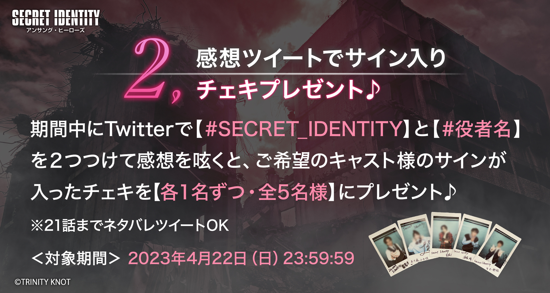 Twitterでハッシュタグ「#SECRET_IDENTITY」と「#役者名」を2つ付けて作品の感想をツイートすると、ツイートしてくださった方の中からご希望のキャスト様のサイン入りチェキを抽選で各1名ずつ、全5名様にプレゼントいたします。