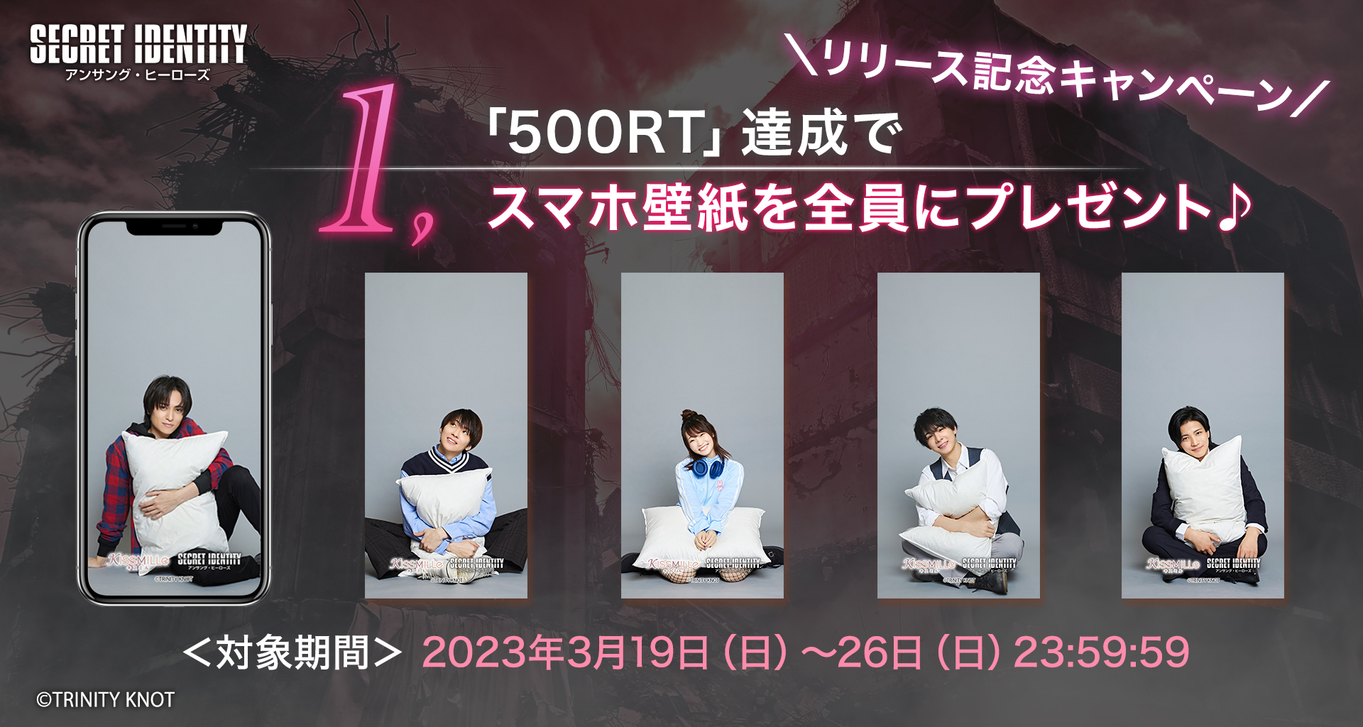 「SECRET IDENTITY ~アンサング・ヒーローズ~」の作品配信記念キャンペーンとして、RTキャンペーンを開催いたします。該当ツイートが500RT達成で、出演者全員のスマホ壁紙をプレゼント。詳細は公式Twitterにてお知らせいたします。