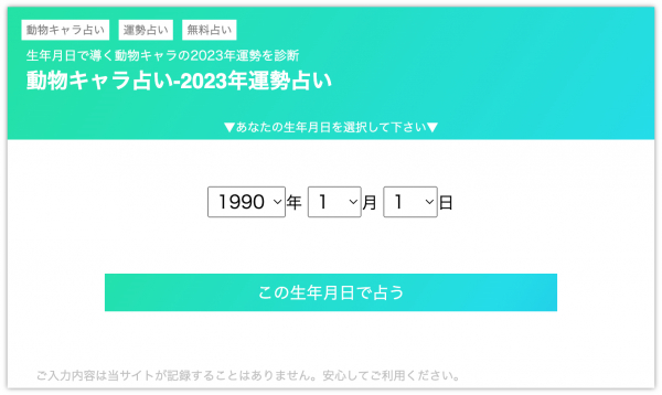 利用者は、自身の生年月日を選択することで利用料無料・登録不要で占うことができ、信頼度の高いと言われる東洋占術『四柱推命』由来で出来上がった全60種類の動物キャラで構成された精密鑑定結果を受け取ることができます。該当の動物キャラの新年度にむけた「2023年運勢」を無料で占うことが可能です。