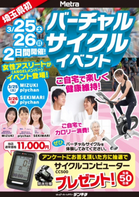(株)METRAが3月7日販売を開始した「バーチャリ」(バーチャルアプリ対応型フィットネスバイク)の販促体験イベントを、ANGEL PROJECT(女性サイクリストチーム)メンバーの中からMIZUKI、piychan、SEKIMARIが参加して行われます。この体験イベントは3月25日(土)、26日(日)の両日、オープンしたばかりの家電量販店デンキチ毛呂山店にて10時~16時に実施。今回の体験会でアンケートにお答えいただいた方の中から抽選で50名にサイクルコンピューターをプレゼントいたします。